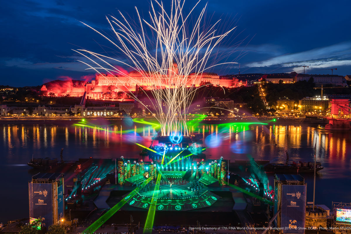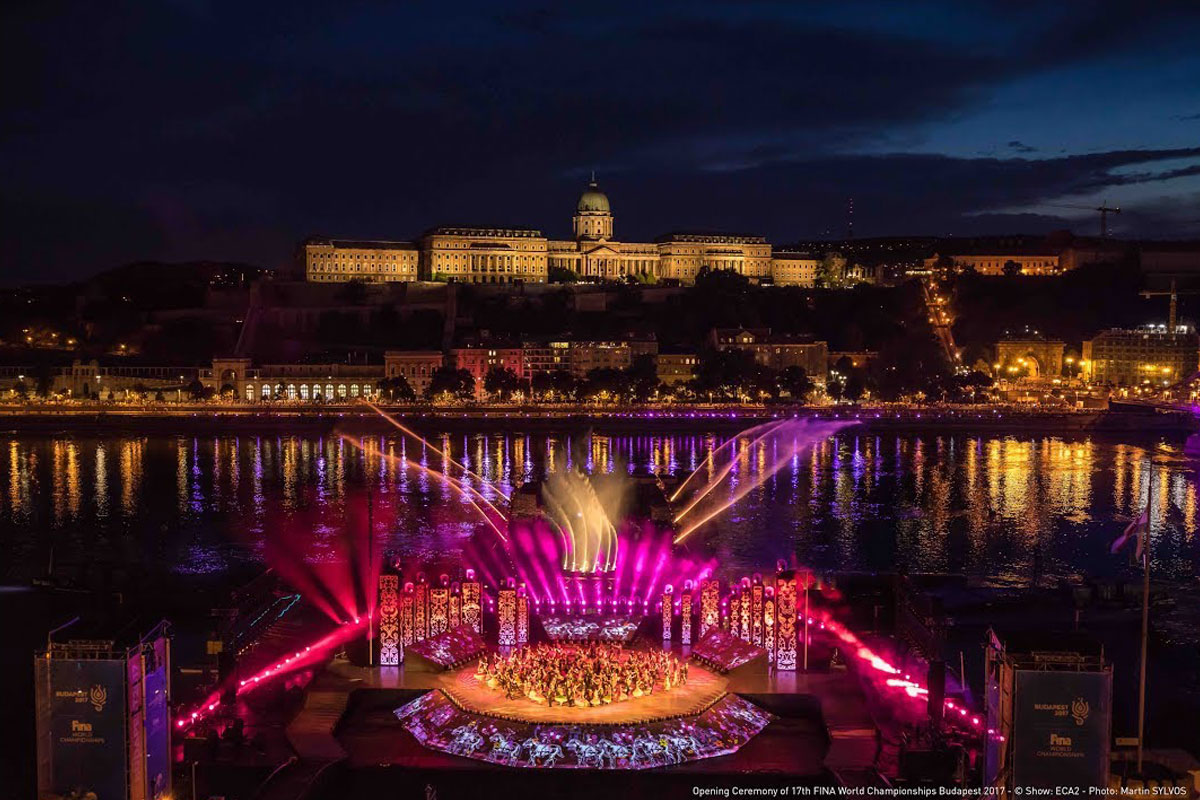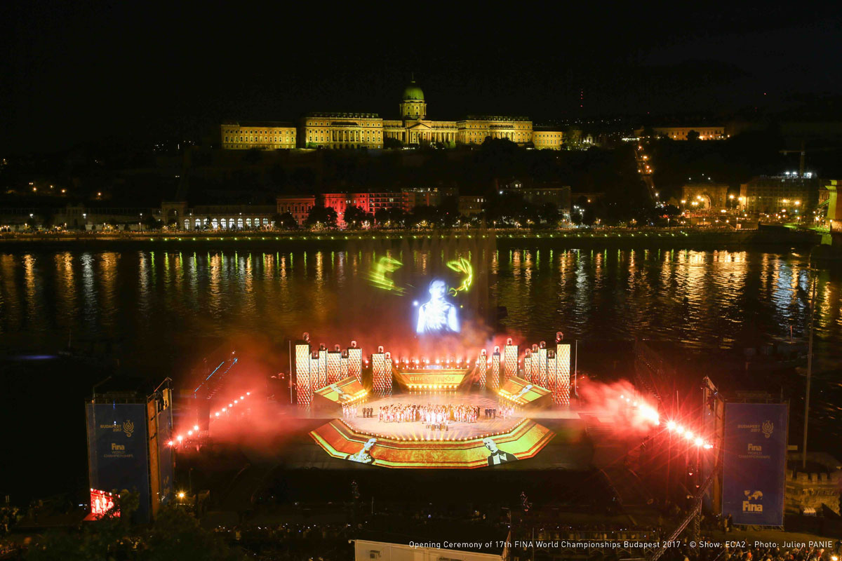 To start the 17th World Championships, FINA's prestigious binennial event, the Hungarian capital and its iconic river, the Danube, were utilised by French showmakers ECA2 and Hungary's cultural hothouse Mupa Budapest, both as backdrops and essential parts of the show into an unforgettable and unique theatrical experience.