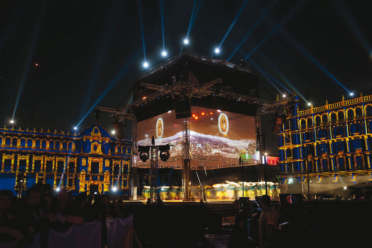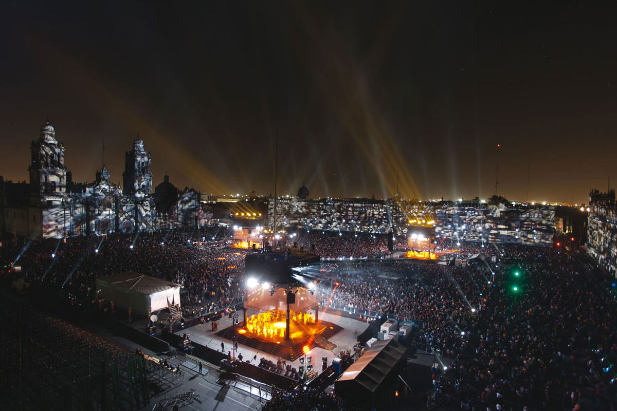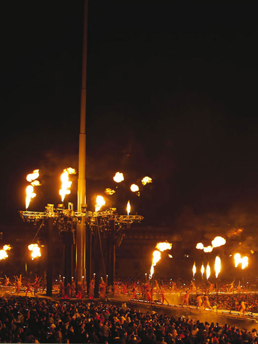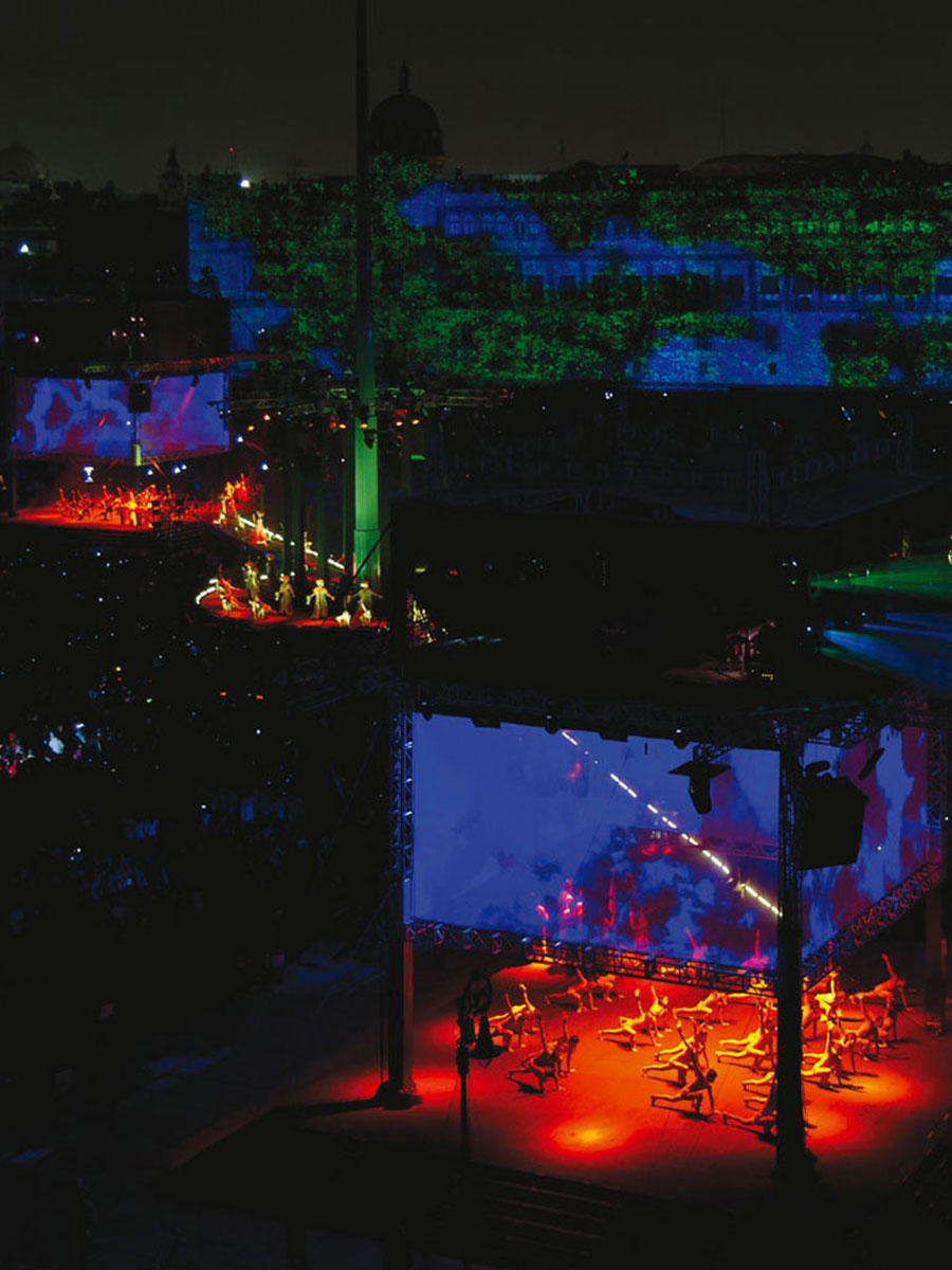More than 12,000 m2 of moving images, 270° projections on Mexico City's main square, the Zocalo, three "Time Machines" -towers that discreetly housed the lighting, projection, mist, flames and pyrotechnic effects equipments; a central stage, along with three stages at the feet of the "Time Machines", where more than 300 artists performed, and 100 m of catwalk joining the four stages, meant the throngs of spectators could be as close as possible to the performers.