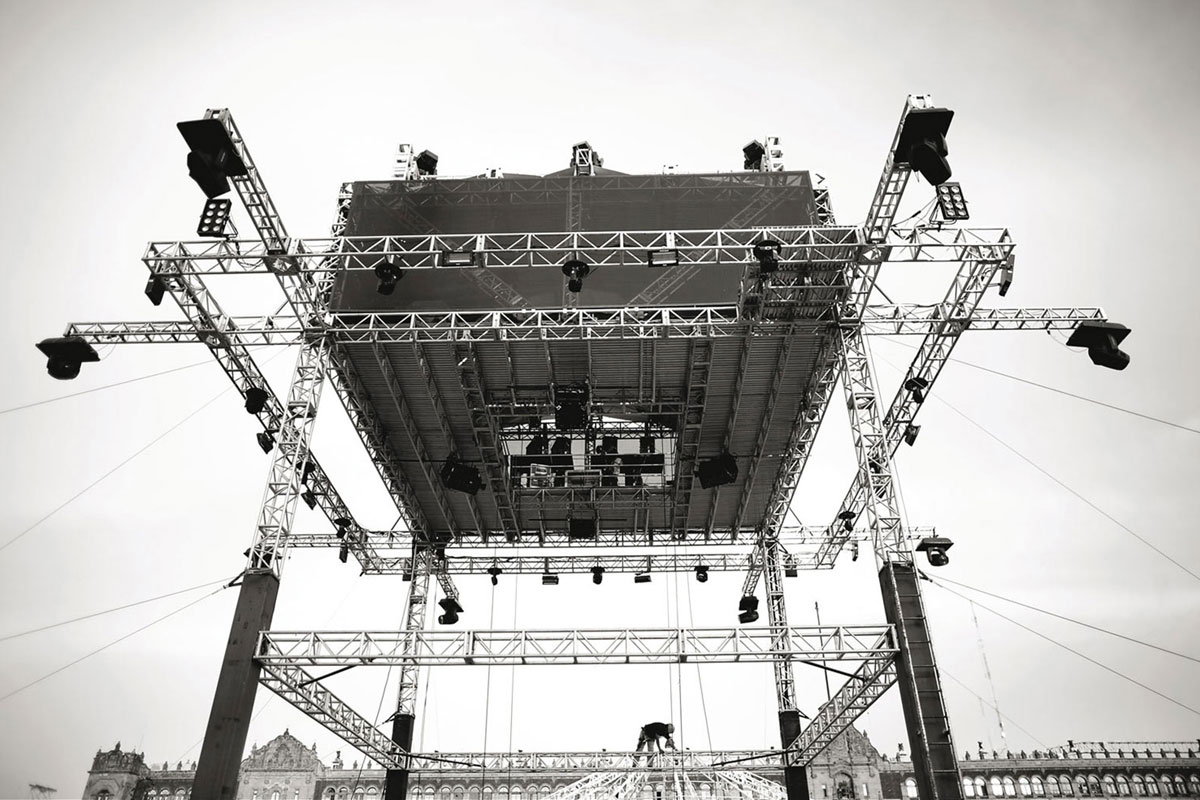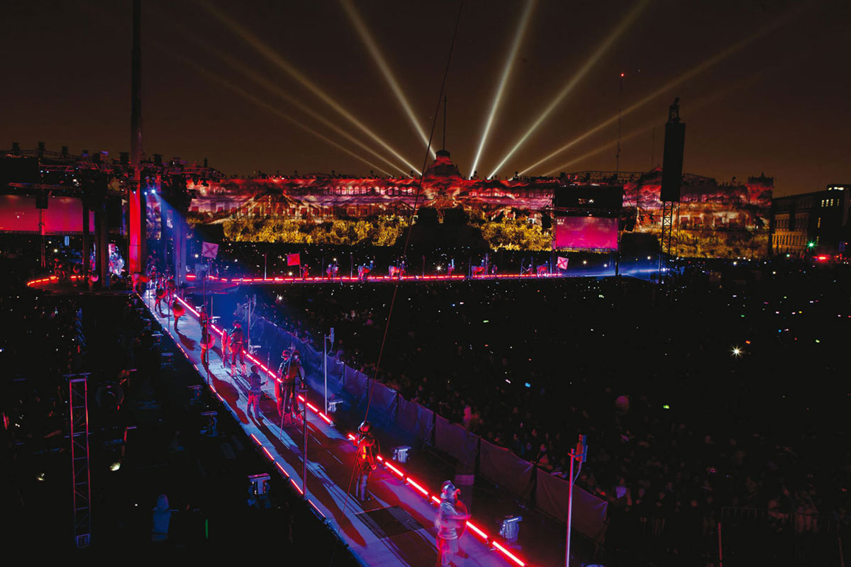 More than 12,000 m2 of moving images, 270° projections on Mexico City's main square, the Zocalo, three "Time Machines" -towers that discreetly housed the lighting, projection, mist, flames and pyrotechnic effects equipments; a central stage, along with three stages at the feet of the "Time Machines", where more than 300 artists performed, and 100 m of catwalk joining the four stages, meant the throngs of spectators could be as close as possible to the performers.