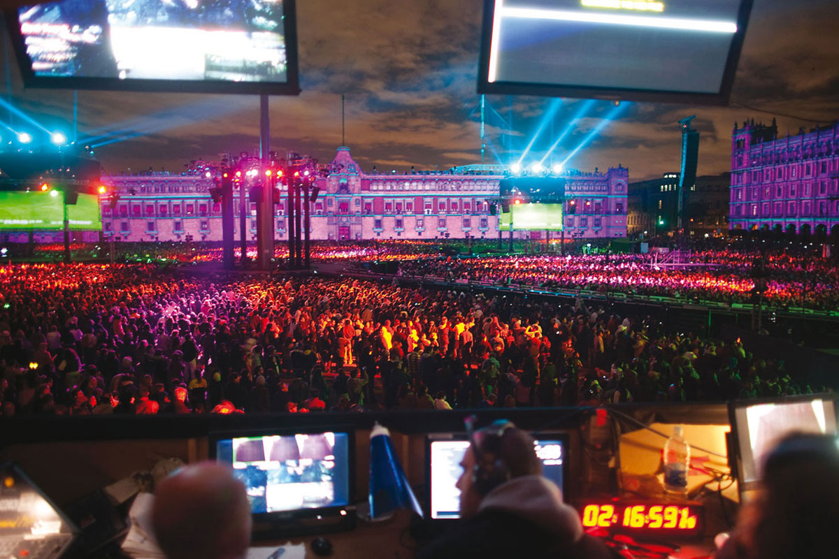 More than 1,400 costumes and 600 props evoked the different periods in Mexico's history; 55 video projectors (20,000 lumens) projected images onto the facades around the square; 12 high-resolution (18,000 lumens) video projectors for 12 tulle screens measuring 9 X 4.5 meters; more than 50 flame generators, as well as a circular pyrotechnic display brought the show to its climax and gave rise to lasting emotions. Faultless sound quality was achieved through the use of 16 Line Array systems, which enabled the original soundtrack to be transmitted from any point on the square according to show requirements.